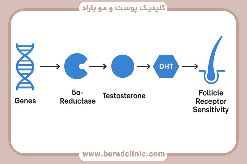 تستوسترون به‌تنهایی هورمونی نسبتاً خنثی برای فولیکول مو محسوب می‌شود؛ مسئله اصلی زمانی آغاز می‌شود که این هورمون تحت اثر آنزیمی خاص به شکل فعال‌تر خود یعنی دی‌هیدروتستوسترون (DHT) تبدیل می‌گردد. این تبدیل توسط آنزیمی به نام  5α-reductase انجام می‌شود؛ آنزیمی که نقش آن در زیست‌شناسی فولیکول مو، به‌ویژه در آلوپسی آندروژنیک، کاملاً تعیین‌کننده است.